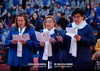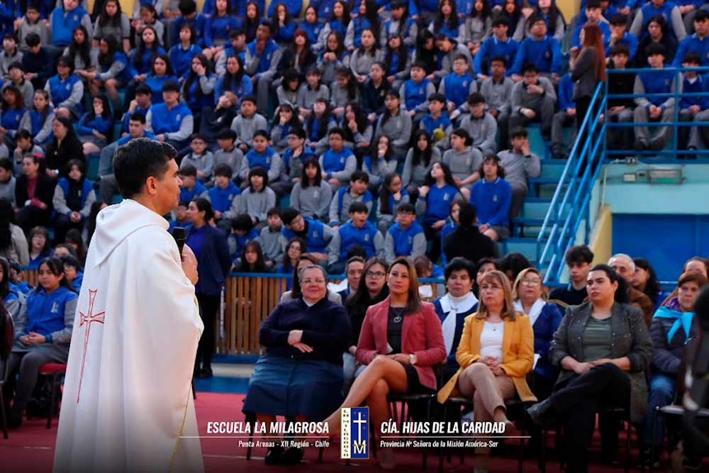 La Eucaristía fue presidida por el P. Bernardo Astudillo, Párroco de Nuestra Señora de Fátima y se vivió en un ambiente festivo de fe y gratitud. La participación activa de los estudiantes en los distintos momentos litúrgicos reflejó su compromiso y pertenencia al carisma vicentino. En la ocasión se renovaron votos y se bendijeron las voluntarias de la Asociación Internacional de Caridades (AIC): Doña Teresa Durán, Doña Julia Galindo y Doña Rosa Vidal, confirmando su entrega al servicio de los más necesitados, siguiendo el espíritu de San Vicente (www.escuelalamilagrosa.cl)